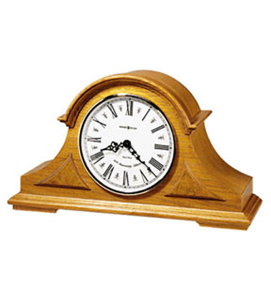 Howard Miller Burton - Tambour mantel clock with moldings and burl overlays, convex glass crystal, polished brass tone bezel, oak. Quartz has dual chime with volume control and automatic nighttime chime shutoff option.