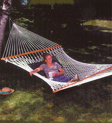 Handmade using 100% natural cotton knotted onto outdoor plated rings. 63” x 84” with an overall length of 14 feet. (Stand is NOT included)