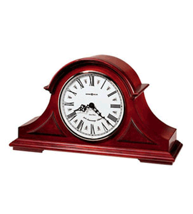 Howard Miller Burton - Tambour mantel clock with moldings and burl overlays, convex glass crystal, polished brass tone bezel, cherry. Quartz has dual chime with volume control and automatic nighttime chime shutoff option.