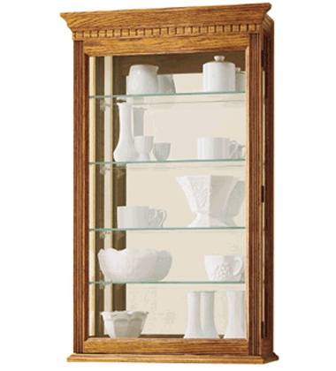 Howard Miller Vancouver Wall Curio - Oak. Case features a mirrored back, adjustable glass shelves and hinged access doors on either end.
