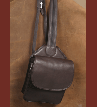 Sling Bag - Adjustable zipper shoulder straps convert from a one-strap sling saddle bag to a backpack. Fully lined in 600 denier nylon, USA made leather in black, dark brown or clay.