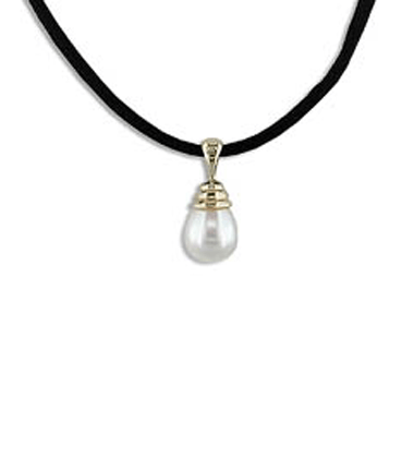 Pearl Necklace - 9-9.5mm cultured pearl, set in a 14K pendant on a 16 black satin cord