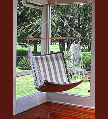 Size: 26" wide x 22" deep x 28" high back. Made of heather beige and white stripe Glen Tuff fabric. Heavy duty macramé clewed ends on steel rings. made of 100% mildew resistant polyester rope cord, 40" wide hardwood spreader bars, extra thick foam filled cushion both front and back, extra wide seating.