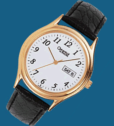 Mens, white dial, black leather strap. Water resistant to 100 feet