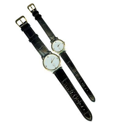 Color logo imprinted, black leather strap, stainless steel, 18K gold plating, water resistant.