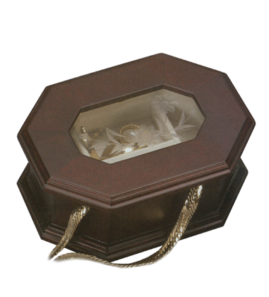 Etched glass lid, mahogany finished hexagonal wooden box.