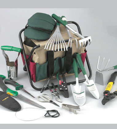 Tool chair w/ detachable tote, bow rake, hoe, spring rake, trowel, transplanter, cultivator, aluminum handle loopers, cable saw, stem stripper, bulb planter, swivel holster, knee pads, pruning saw, fruit shears, floral shears, anvil ratchet, and root saw.