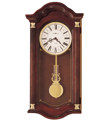 Wall clock with arched bonnet, stenciled glass, polished brass pendulum, reeded columns with brass finished caps, cherry finish on select hardwoods and veneers. Quartz, dual chime battery movement features volume control and automatic nighttime chime shut-off option.