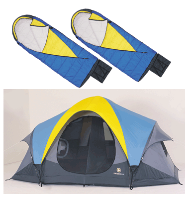 Swiss Gear 12’ x 8’ 2-room dome tent, 88 sq. feet, will sleep 4. Carry weight 17 lbs., rain shingle floor protector, 1 flex door, 2 D doors, shockcorded fiberglass frame, gear loft organizer & mesh utility pockets. Two 33" x 86" diagonal zip bags, +25 degree rating, 3 lbs. Swiss-Therm fill, polyester outer, polyester cotton percale liner, contoured hood w/ drawstring, fleece lined foot w/ zipper for ventilation.