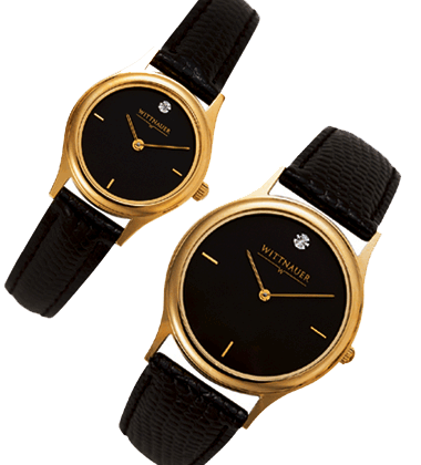 Stylish face accented by a diamond at 12:00. 23K finish, Swiss precision quartz movement, black leather strap, water resistant to 100 feet.
