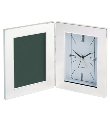Chrome finished metal case, velvet finished back, protective lens, holds 4" X 6" photo, battery operated.