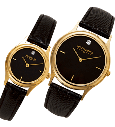 Wittnauer Watch - Stylish face accented by a diamond at 12:00. 23K finish, Swiss precision quartz movement, black leather strap, water resistant to 100.’