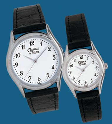 Caravelle with white dial, stainless steel, black leather strap, water resistant to 100 feet.
