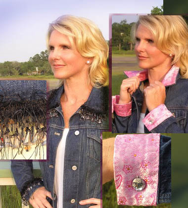 Classic Jean Jacket, 100% cotton denim, tapered fit and 2 inside pockets (perfect for storing cellphone, keys, wallet & lipstick). "Pink Paisley" features pink flower brocade fabric covering the collar and both sides of the cuffs and 13 Swarovski crystal buttons. "Black Starry Night" features black fringe with multi-colored dangling beadwork trimming the collar and cuffs and 13 brushed silver "joluka" buttons.