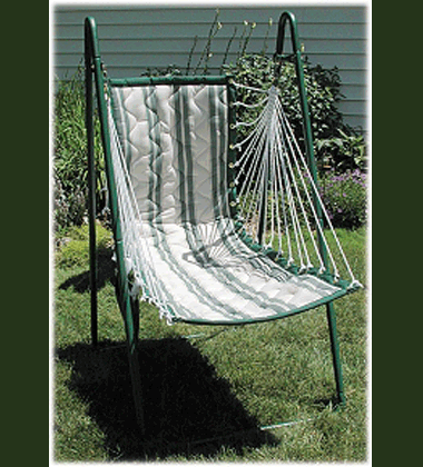 Soft Comfort Z-Quilted Swing Chair and Stand Combination - Chair Size: 26 wide x 80 long. Made of Glen Tuff fabric in earthtone stripe with green solid back. Heavy duty macramé clew ends on steel rings, 100% mildew resistant polyester rope cord, extra thick foam filled Z-quilt stitching. Stand is powder-coated huntergreen, 64 high x 36 wide x 45 long, sturdy yet compact swing frame.