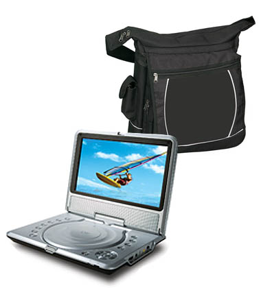 8.5" widescreen (16:9) color TFT display DVD/CD/CD-R/CD-RW/MP3/JPEG compatible, built-in stereo speakers, lithium-ion rechargeable battery, remote, AV cable, 100-240V AC adapter, DC car charger & car cassette adapter, 2 headphones and headrest mounting bag. Carry bag holds player, accessories and your supplied extras. 600D poly trimmed in ultra-modern tech dots.