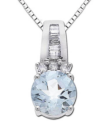 14K white gold setting, 18" white gold box chain and 1.0 tgw aquamaine with 0.12 ctw diamonds.