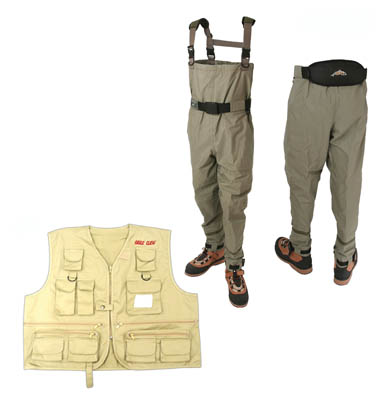 Waders constructed w/ waterproof, breathable, 4-layer Aqualex fabric. Shoulder straps convert waders from chest high to waist high quickly. Feature double layer of fabric from knees to ankles, built-in gravel guard, heavy duty belt and 12" inside pocket. Inseam 35" / Men's sizes XS-XXXL; women's sizes S-XLT. (Boots NOT included.) Fishing vest has 16 pockets and is made from durable, breathable cotton fabric with oversized arm openings for all day comfort. Unisex size S - 3XL.