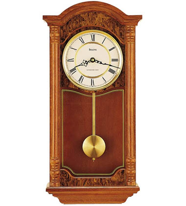 Edenhall, solid oak case, with recessed glass side panels, burl pattern accents, finished in dark oak. Dual chime movement plays Westminster or Whittington melody on the quarter hour, counts the hour. Features volume control and night time shut off option.