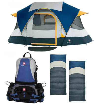 Set includes: A 14' x 11' x 72" tent with round based design, rounded side windows, protective awnings, hoop frame over entryway, e-port, factory taped fly seams, Dutch "D" style door and duffle bag. Two sleeping bags, filled with 4 lbs. Swiss Therm polyester, +30 degree temperature rating, high count polyester outer, polyester cotton percale liner, self-repairing zipper, quilt-through construction and duffle bags. One 2-bottle expandable waistpack, 420 nylon velocity / 600 polyester with large main compartment, side mesh water bottle pockets and 2 GE Lexan bottles.