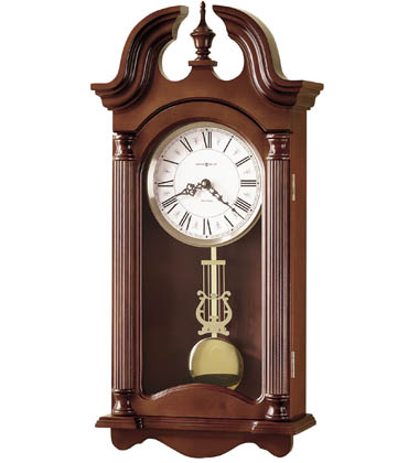 Everett offers a classic look with swan neck pediment, turned finial, and reeded columns. Polished brass accents the dial and brass-finished pendulum and lyre. Finished in Windsor Cherry on select hardwoods and veneers. Quartz, dual chime movement plays Westminster or Whittington chimes with an hour strike, volume control and automatic nighttime chime shutoff.