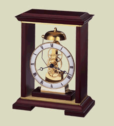 Bulova Queensbury Clock - Solid wood case, mahogany finish, brasstone metal accents, German made skeleton movement, strikes the hour. H: 7.75 W: 6 D: 3.25