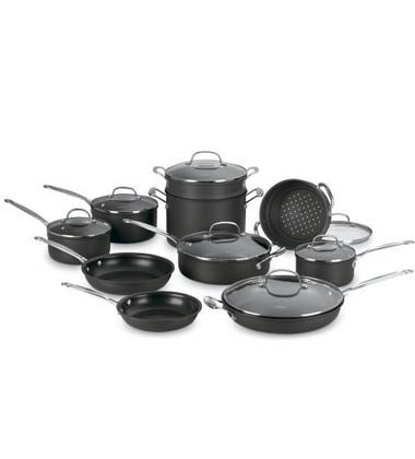Hard anodized construction, quantanium nonstick. 1 1/2 - 2 & 3 qt. saucepans with covers, 4 qt. covered saute, 9 qt. stockpot, cover, 9 1/2" pasta steamer, cover, 7 3/4" steamer, cover and 8" - 10" & 12" skillets.
