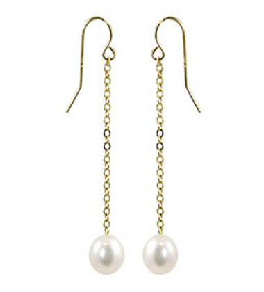 Pierced, 14K 7-8mm freshwater cultured pearl chain drop earrings.