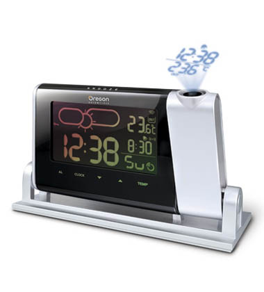 Oregon Scientific clock with weather forecast icons, Atomic projection clock, colors are determined by the status of the 12-24-hour advance forecast. Clock projects precise Atomic time and outdoor temperature in large, easy-to-read numbers on any flat surface. Sensors will automatically turn on the projection.