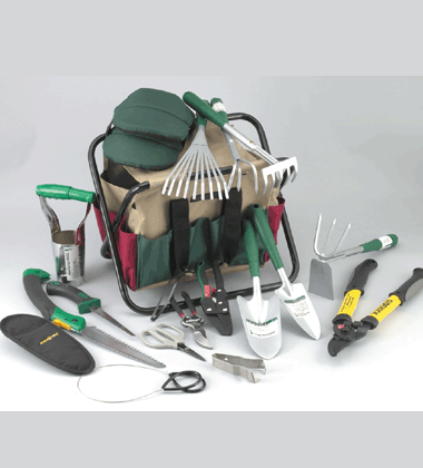 18 pc. Gardeners Deluxe Tool Kit - Includes Tool Chair w/Detachable Tote; Bow Rake; Hoe; Spring Rake; Trowel; Transplanter; Cultivator; Aluminum Handle Loppers; Cable Saw; Stem Stripper; Bulb Planter; Swivel Holster; Knee Pads; Pruning Saw; Fruit Shears; Floral Shears; Anvil Ratchet; Root Saw