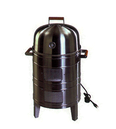 Meco Electric Water Smoker - 351 sq. in. cook surface, 5 1/2 qt. water pan, sliding doors, 1650 watt heating element plugs into standard household current. Stainless steel with temperature gauge and protective cover (not shown).
