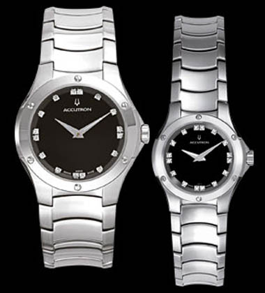 Swiss Made, 16-diamonds, black enamel dial, domed sapphire crystal, four-screw casebacks, stainless steel case and bracelet, deployment buckle closure, water resistant to 50 meters.