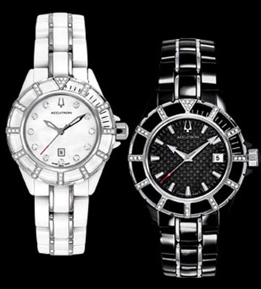 Mirador Collection both man’s and woman’s have rotating ratchet bezel ring, white luminous hands, eight-screw caseback, deployment buckle closure with lock and are water resistant to 50 meters. Man’s has 39 diamonds set on case and