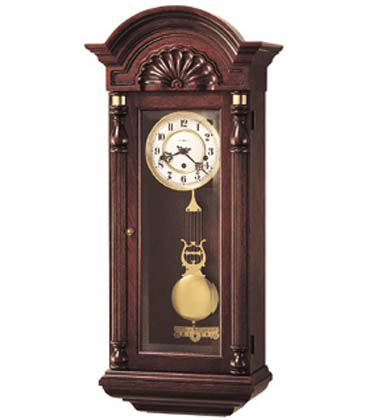 Individually carved, scalloped shell on the pediment is designed similar to a John Goddard original, front-opening beveled glass, polished brass lyre pendulum, finished in Vintage Mahogany on select hardwoods and veneers, key-wound, triple chime movement with chime silence option and durable bronze bushings.