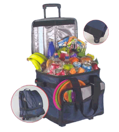 Durable, collapsible, leak proof, easy rolling wheels, telescoping handle, and carrying handles.